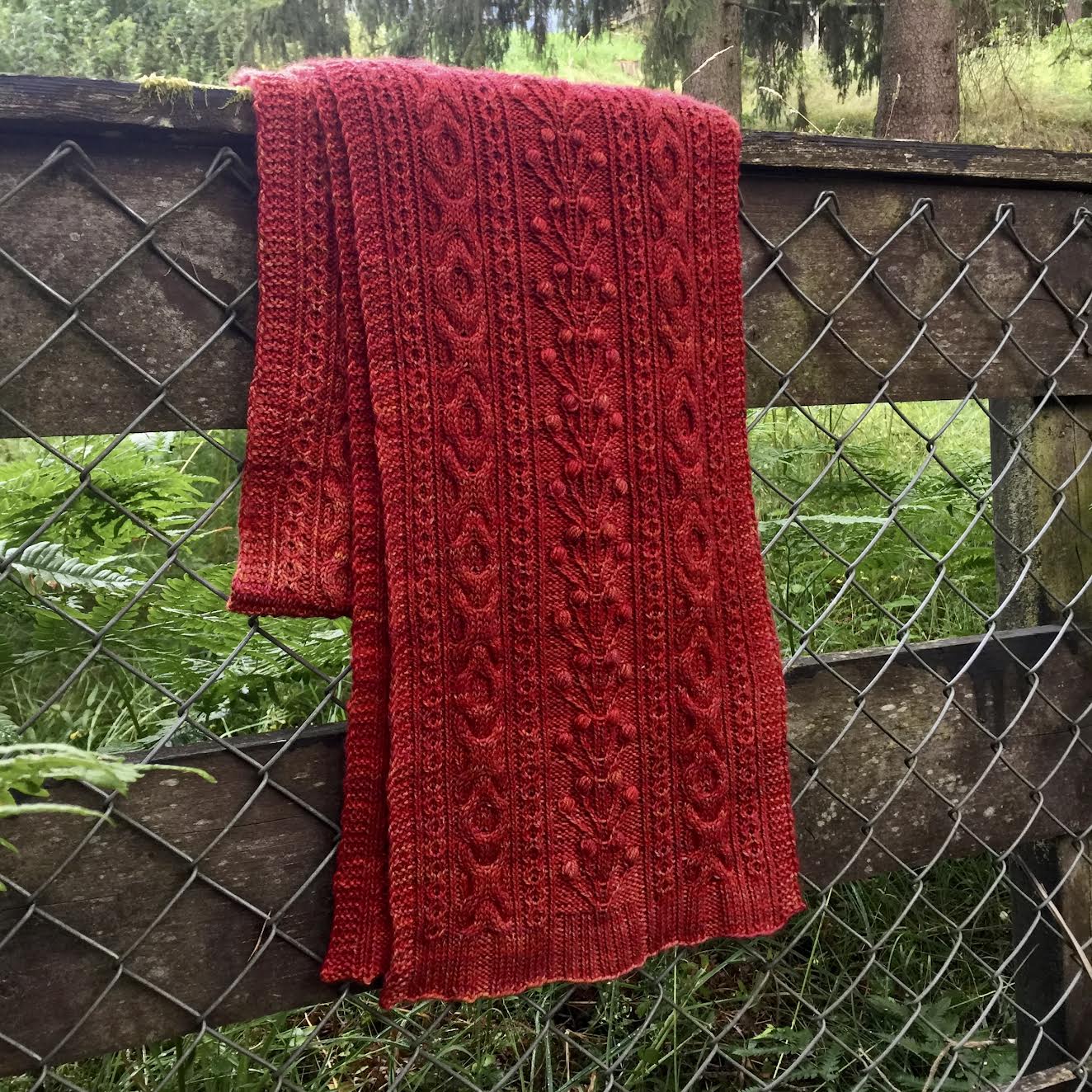 This week's pattern is the Kalyna scarf, designed in collaboration with Biscotte Yarns. Kalyna means red viburnum in Ukrainian, and the scarf features a central cable-and-bobble motif that echoes the berries of this plant. The sample scarf was knitted in a soft and squishy merino/cashmere blend, perfect for snuggling up in against the cold.