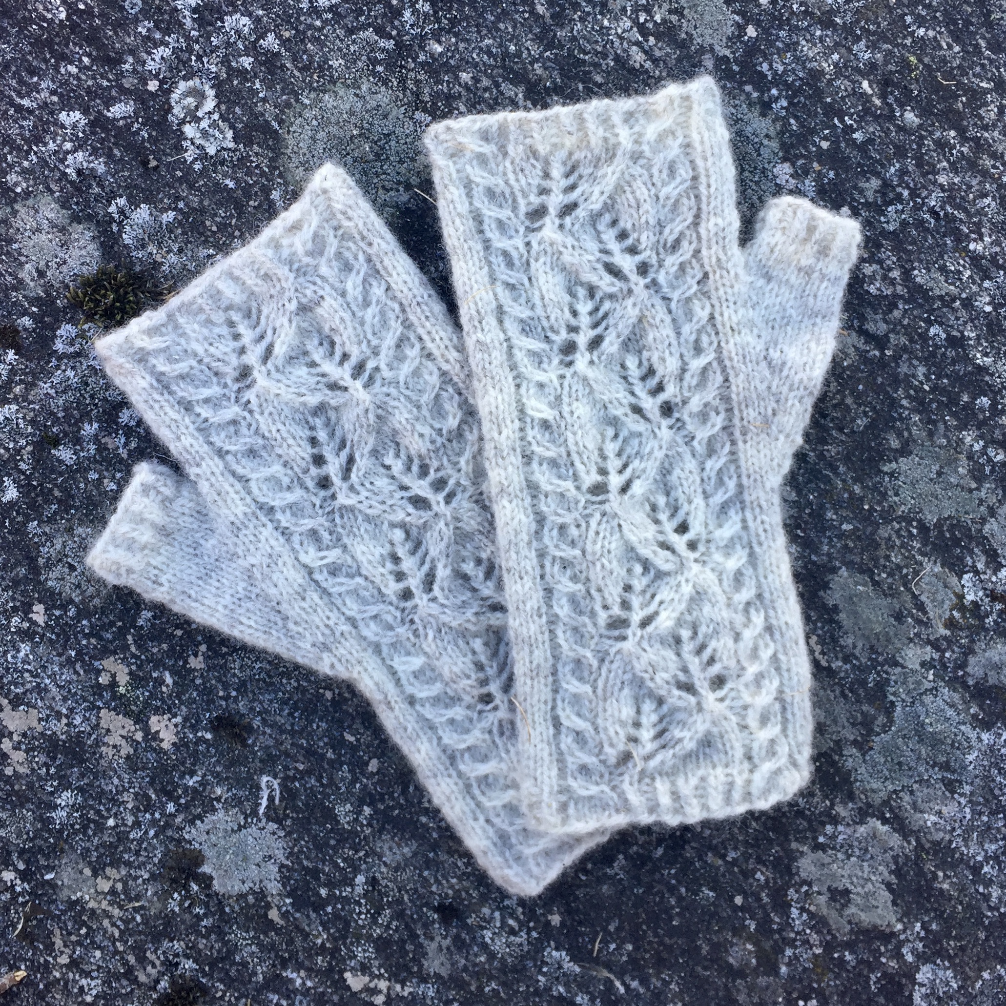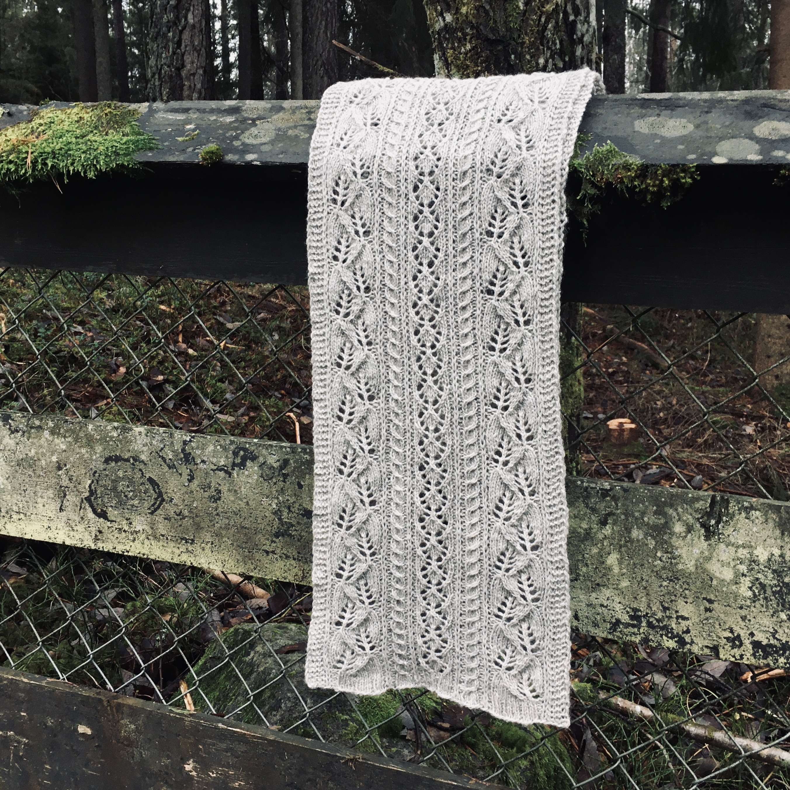 This week's pattern is a reworking of one of my earlier designs, the Maridal shawl, into a scarf. I designed the original triangular shawl for Blacker Yarns a few years ago, and I still love the lacy leaf and cable motif. For the scarf, I used DK weight yarn so it works up quickly to make a chic and snuggly accessory for the winter. And if you're not into scarves or shawls, then matching fingerless mitts are available too.
